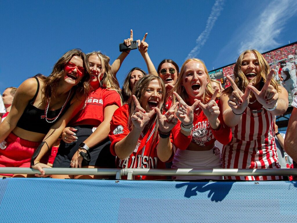 The University of Wisconsin Madison students at a 2021 football game between Notre Dame Fighting Irish and the Wisconsin Badgers at Solider Field in Chicago.